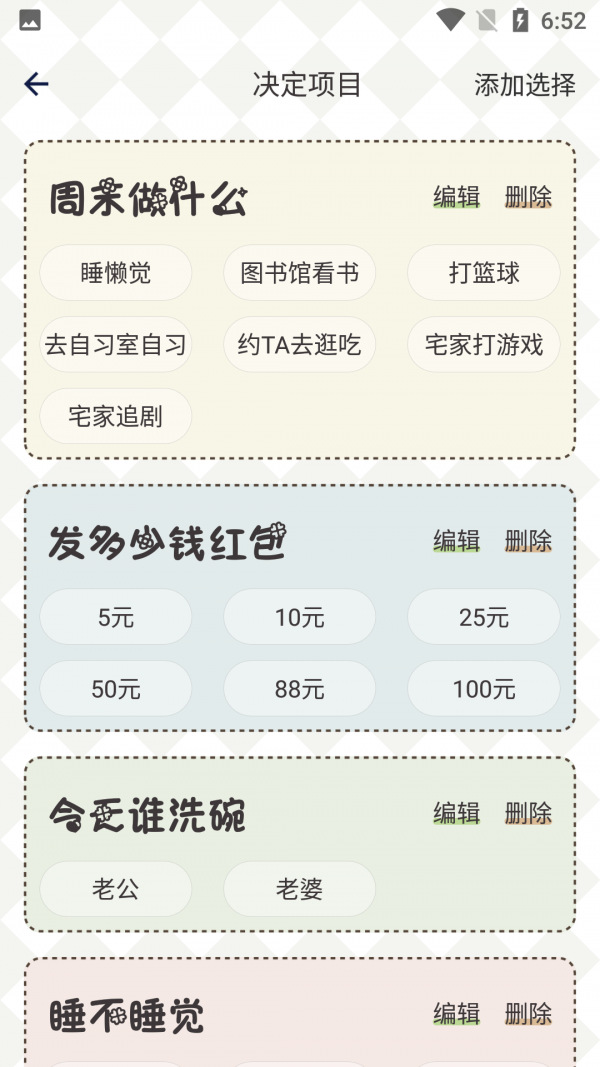 人生有很多难事,其中做决定算一项。对于选择困难症患者来说,最难的便是做决定了。那么这类人群,可以尝试使用纯运幸运小决定app,将决定交给机器,释放自我。软件可以帮助我们解决各种选择问题,比如最难的一日三餐吃什么。输入项目后,就可以转动转盘决定啦。