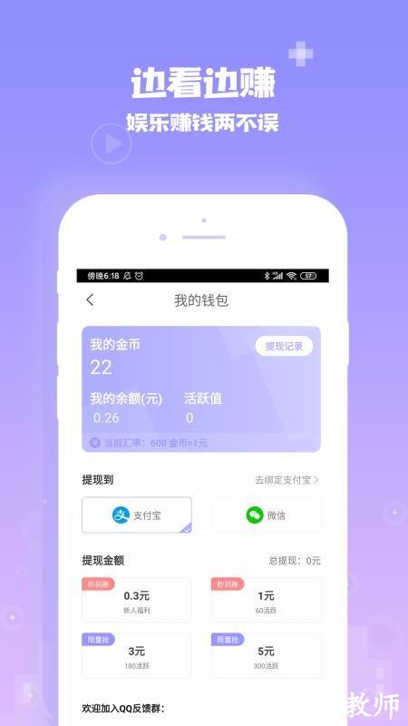 5、在我的钱包界面可以查看赚取金币,随时都能提现使用