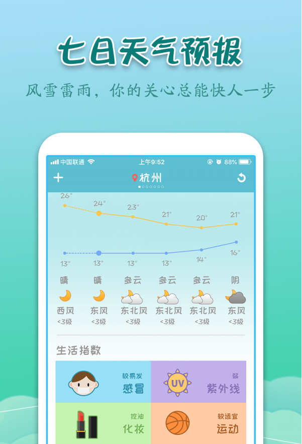 2. 功能强大:除了基本的天气查询功能外,还提供了多种生活指数查询,实用性高。