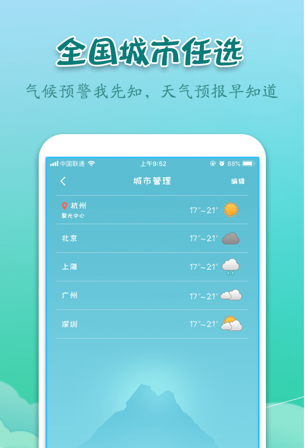 3. 城市添加:用户可以自由添加多个城市,随时切换查看不同地区的天气情况。