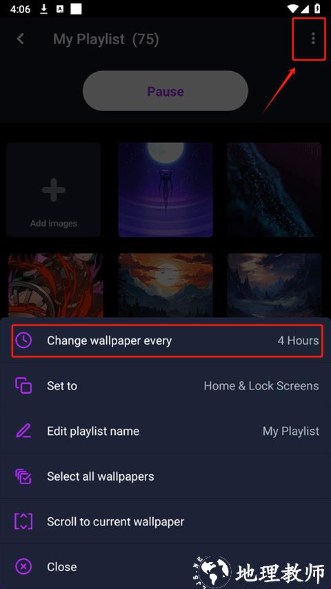 6、此外点击右上角三点图标,还能自定义每次更换壁纸的时间间隔