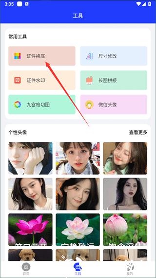 3、进入【工具】页面后,可根据所需功能编辑图片,此处以【证件换底】功能为例演示