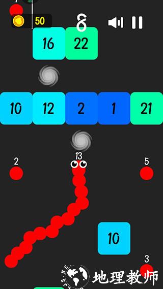 4、以某模式为例,游戏界面如图所示:通过移动 “蛇” 的位置,吃掉红色的球,“蛇” 会逐渐长大;