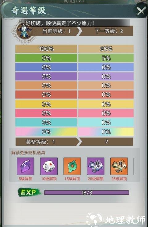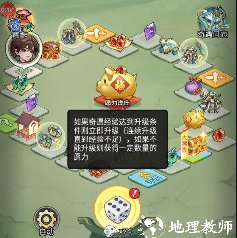 6、走到 “升级” 格子时,若奇遇经验满足升级条件则自动升级,经验不足则随机获得部分奖励;