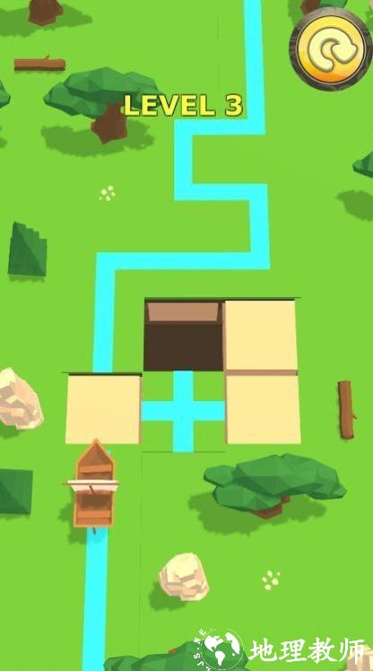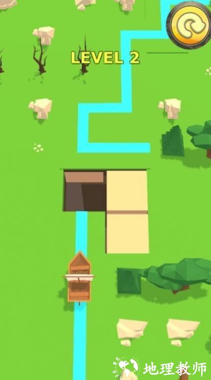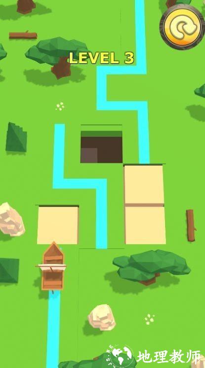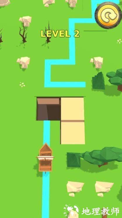 1、手指触屏,玩家需要挪动障碍物的位置,让小船可以轻松过河;
