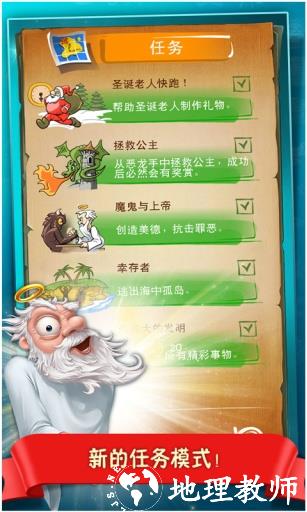 涂鸦上帝,发挥你的想象,成为造物主创造的力量就在你手中!在这个让人上瘾、适合所有年龄人士的谜题游戏中,将火、土、水和空气等元素混合匹配,创造出整个宇宙!当然,宇宙不是在一天内创造的。你必须从简单的微生物入手,创造出动物、工具和风暴;你甚至可以在具有 创造宇宙的能力之前打造一支军队!但请注意,创造的力量可能会产生你不希望出现的后果,发明轮子可能会导致僵尸肆虐...不过不要担心,在这一宇宙之旅中,你并不孤单!每次成功创造新的物品后,作为奖励,你将获得历史上较伟大的哲学家和喜剧演员的智慧和才思。用 Doodle God? 释放你内在的上帝!