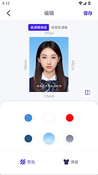 4、一键换底:除常见底色,还有渐变蓝等高级色,3 秒抠图换背景,自动裁剪,一键保存。