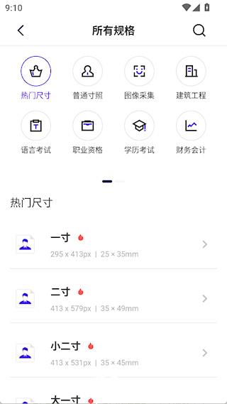 1、丰富尺寸:涵盖一寸、二寸等常规寸照,还有考试、签证、身份证等 600 多种规格,也支持自定义大小和像素。