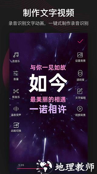 2、音乐视频:3D 环绕音乐与特效融合,精准识别歌词,快速制作动感音乐视频。