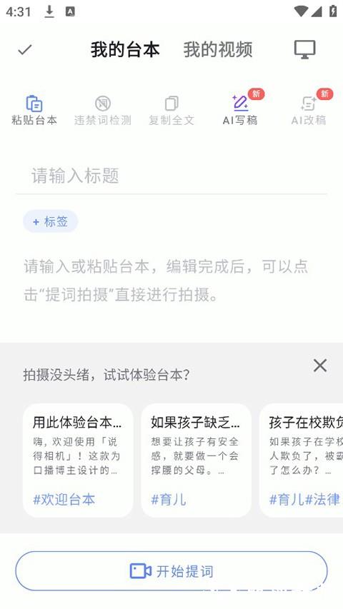 3、新建台本后,需要输入视频所需的台本内容并自定义标题。