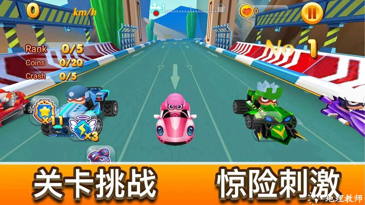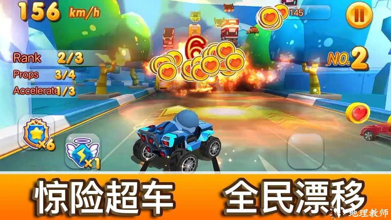 1、玩家可以在游戏的赛道中找到各种有趣的道具,可以发射导弹。
