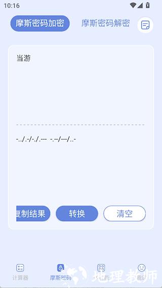 4、摩斯密码技巧:输入文字后点击加密按钮得到摩斯密码,复制给对方,对方粘贴后解密即可查看内容。