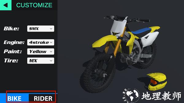 6、玩家还可以点击“customize”更改车辆及驾驶员的外观,打造一辆自己的专属摩托车