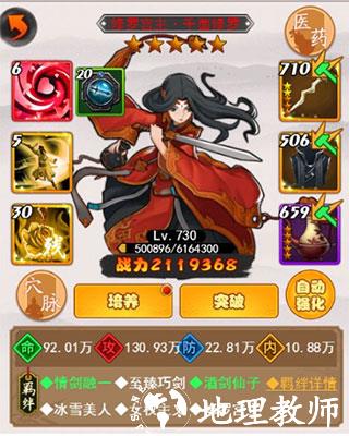 5、技能升级优先升级心法,心法升级带来的属性增益极大,其次在考虑升级重要角色的主力技能,如修罗宫主的万花剑法,蓝凰儿的野蜂乱舞。原则就是优先升级主角色的心法主属性和主力输出技能。