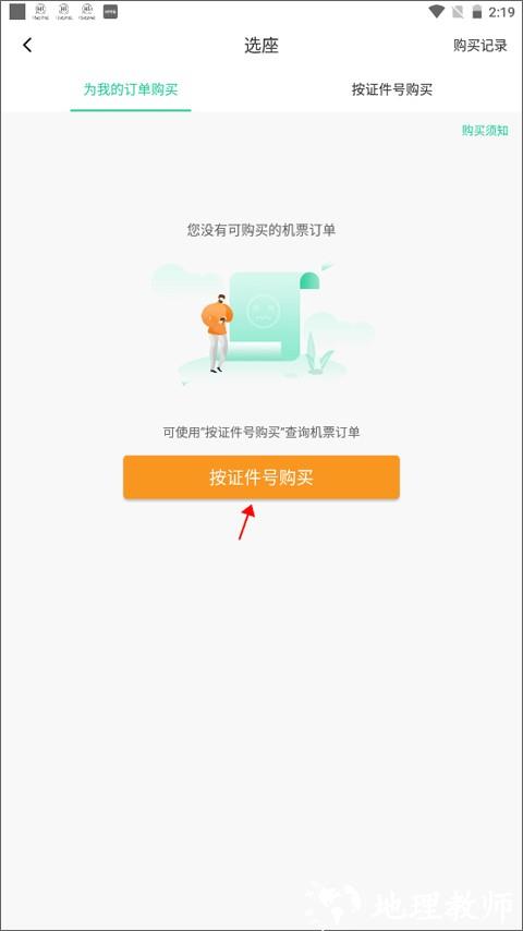 2、这时你还没有购买的机票订单,所以如果想选座的话可以按证件号查询机票订单,点击“按证件号购买”。