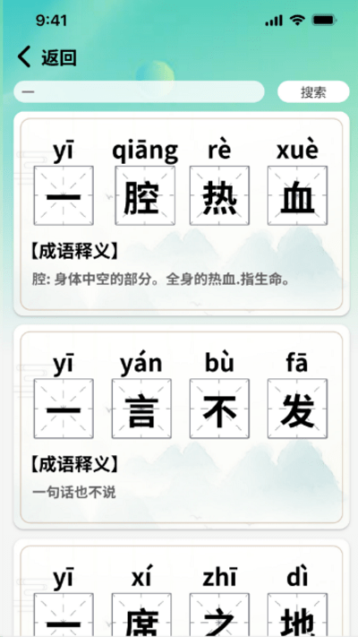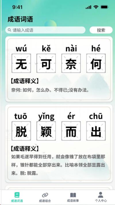 1. 成语词典功能:软件内置成语词典,用户可以快速查找成语的释义、来源和用法。
