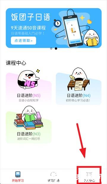 1、下载安装饭团子日语应用,打开后点击界面中的【个人中心】。