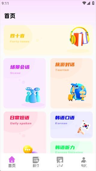 1、进入应用后,可直接看到各类场景对话功能,还能学习韩语四十音相关内容。