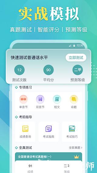 1、平台提供普通话水平测试全真模拟系统,完全按照正式考试流程设计。包含字词朗读、文章阅读和命题说话全部题型,实时生成评测报告。