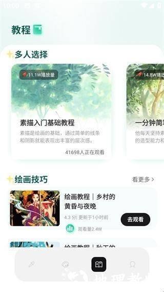 3、选择下方工具栏的 “教程” 板块,里面包含各类学习教程与绘画技巧,可根据自身需求选择学习内容。