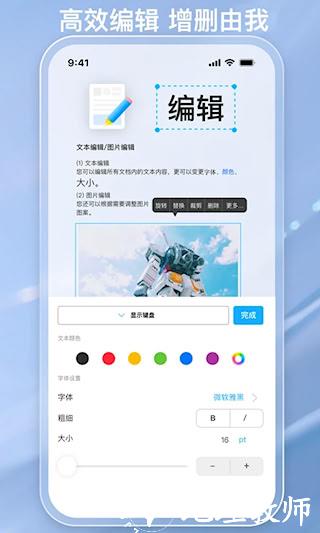 1、 一项重要创新是实现了在移动端对PDF文本进行直接编辑,如同在文字处理软件中操作一样。可直接修改字体、字号,避免了传统流程中需先转换格式的繁琐步骤。