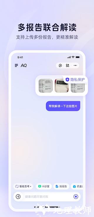 AQ是一个智能健康管理工具,为个人与家庭健康管理提供支持。服务基础建立在智能算法对健康问题的分析能力之上,能够回应各类日常健康咨询,并对上传的医疗图片进行识别解读。具备个人及家庭成员健康信息的数字化管理能力,可系统记录相关数据。