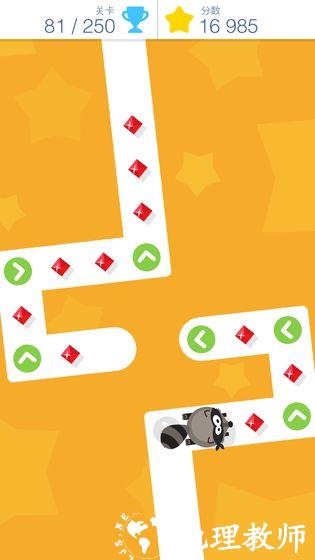 1. 游戏界面:游戏界面简洁明了,上方显示关卡和分数,下方是赛道和角色。玩家可以通过点击屏幕来控制角色的跳跃和转向。