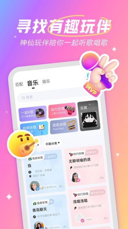 3、有趣玩伴聚集地。diy专属扩列卡,寻找默契玩伴陪你一起听歌唱歌。