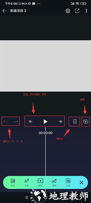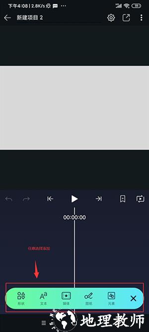 6、通过 “绿色加号” 菜单,可添加形状、文本、媒体(手机本地图片、音乐、视频)、图纸、元素等内容,丰富视频画面;