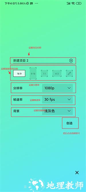 3、在项目设置界面中,可自定义设置项目名称、宽高比例、分辨率、帧速率及背景颜色,根据剪辑需求调整参数;