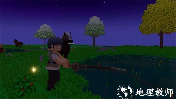 4、钓鱼玩法包含多种鱼类,需自行打造鱼竿、采集饵料,途经溪流或河流时,跳入水中可查看鱼群数量,钓获的鱼可制作或出售。