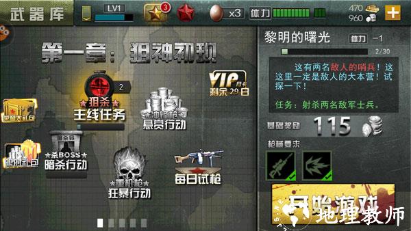 3、海量关卡抗战剧情、战场开启,可化身狙击手深入敌军据点,寻找目标并精准射击;还能使用超级重机枪扫射逃敌,搭配精彩活动与丰富奖励,感受独特爽快体验。