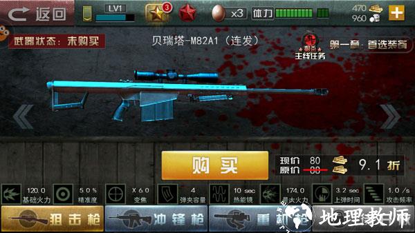 2、武器选择、武器类型丰富,除基础狙击枪外,还有冲锋枪、重机枪等,每种武器留有强化空间,可按任务选择对应类型武器歼敌。