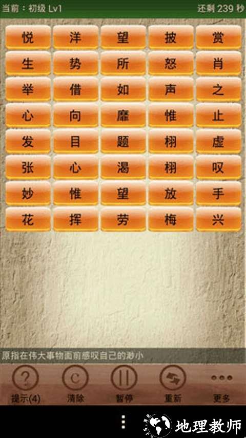 成语消消看是一款休闲益智类小游戏,界面清晰、操作容易,即可以在游戏中学习,又可以在学习中体验游戏的乐趣,丰富自己的成语知识,学习娱乐两不误。是休闲消磨的好游戏!进入主界面后依次点击文字,文字构成一个成语即可消除,在规定时间内消除所有成语即挑战成功升入下一级。游戏分为初、中、高三个难度等级,每一等级各有10关卡、必须依次挑战升级。