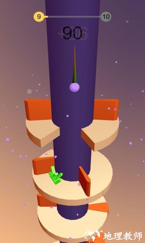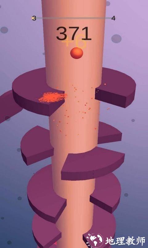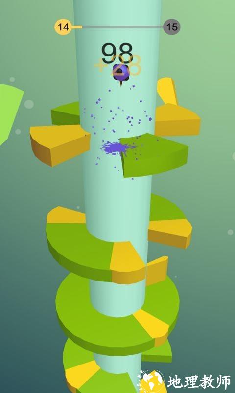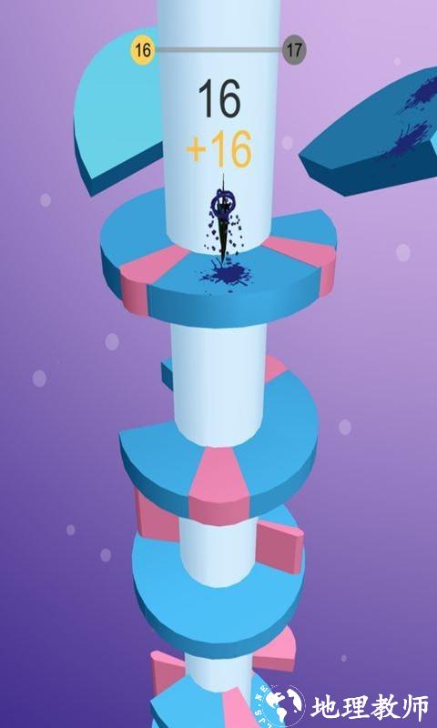 在这个旋转跳一跳中,玩家可以在独特的卡通画风中,享受无尽的螺旋式楼梯闯关,你在这里要控制的不再是前进的小球,而是要控制中间那根旋转的柱子,通过旋转来巧妙的让小球可以躲开所有的障碍下落,落在相同颜色的地方,落的越低,你取得的分数也就会越高。