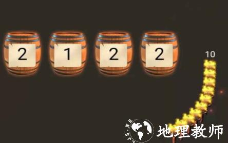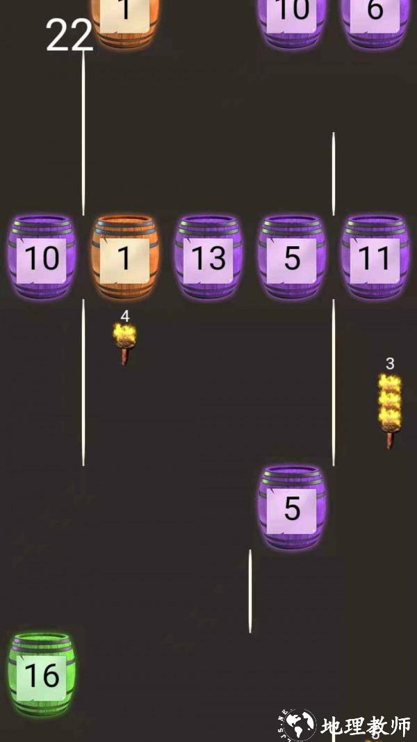 3、遇到同样的火把就收集起来,遇到木桶,就会烧掉。规定时间内,看看能突破多少木桶。