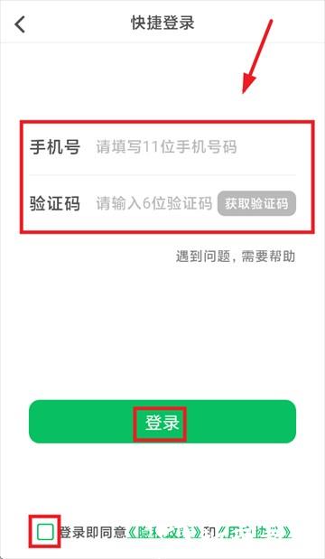 3、最后在快捷登录界面填手机号、输验证码,勾选同意隐私政策和用户协议,点击登录就行。