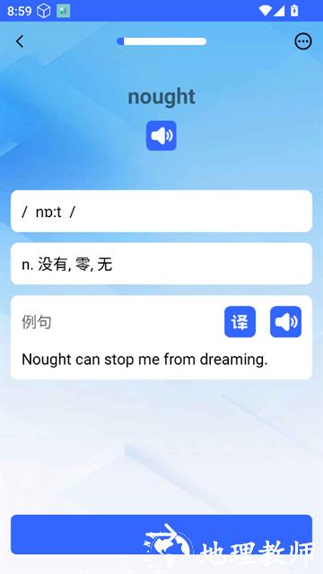 3、进入词书页面即可开始记单词,可从发音、译义和例句三方面入手。