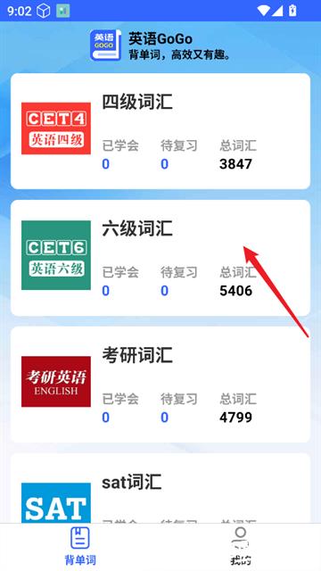2、在首页挑选所需词书,确定学习内容方向。