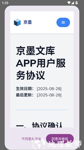 1、下载并安装京墨文库 APP 后,点击【同意并继续】即可进入应用。