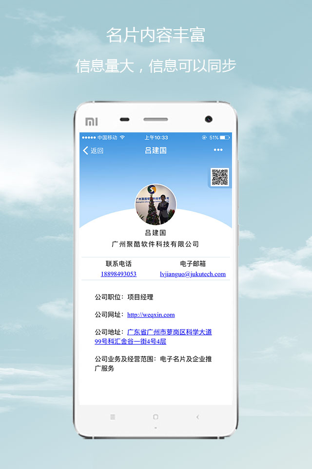 扫描名片二维码,发送名片,以及查看附近的名片,可以方便的进行名片交换。