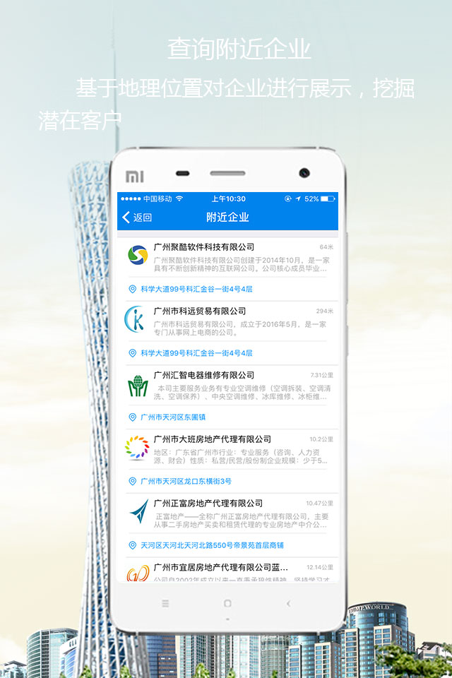 信息管理,以及查找附近商务信息,进行商务交流,打造全新的商务人脉管理;通过微企信,可以查找附近企业,有效增加企业曝光率,助力企业