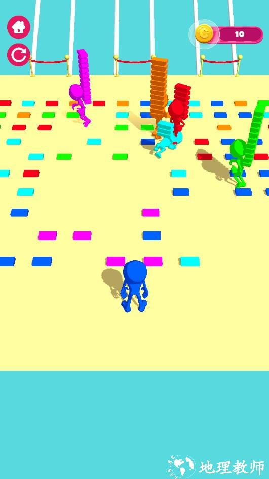 桥梁建造赛跑这个游戏中,你主要的任务就是控制一个橡皮人来这里收集砖块,通过对各种不同颜色的匹配,慢慢的来搭建成一座桥,看谁能够率先到达桥对面,谁就是胜利者,但是这个过程中可谓是充满了挑战性,对于玩家的操作和策略,都是一个考验。
