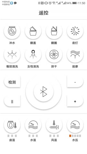 2. 功能菜单:包含开关机、调节水温、座温、风温等多种功能选项。