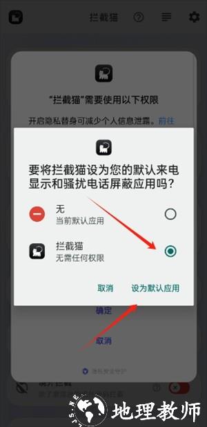 2、进入手机系统设置,将 “拦截猫” 设为处理通话与短信的默认应用程序,确保拦截指令有效执行。