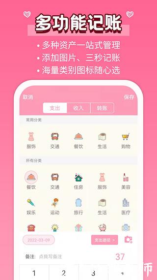 1、提供女性专属记账模板,预设美妆、服饰、下午茶等特色分类。支持自定义标签与彩虹色系标记,满足个性化记录需求。