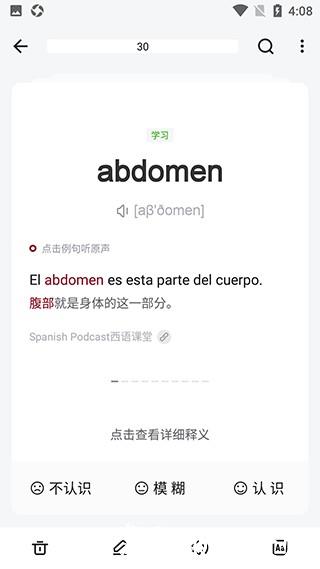 5、课本导入完成后,即可开始西语单词学习;每学完一个单词,点击底部 “认识” 或 “不认识” 按钮,即可切换至下一个单词。