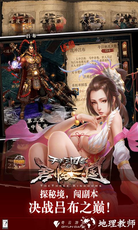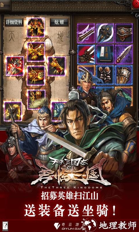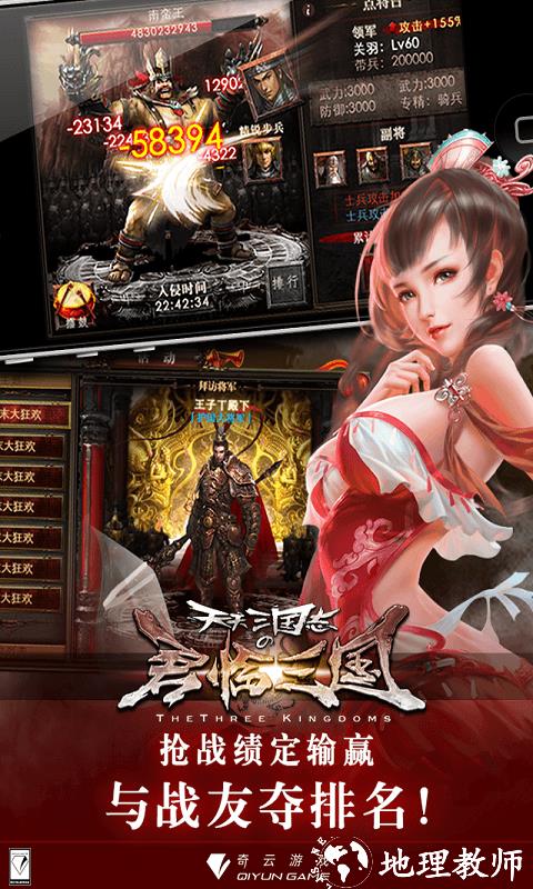 《君临三国》以中国历史上著名的三国时代为背景,进行创造改编烽烟四起,战火纷飞。《君临三国》带您重回英雄辈出的三国时代,在这里您将用后属于您自己的三国城池,君临天下。在这里《君临三国》给您带来较真实的三国武将,浴血沙场。游戏里高帅富与白富美的好配合成为了同生共死的战友。英雄辈出美女如云的年代,试问谁将在《君临三国》里一统天下!