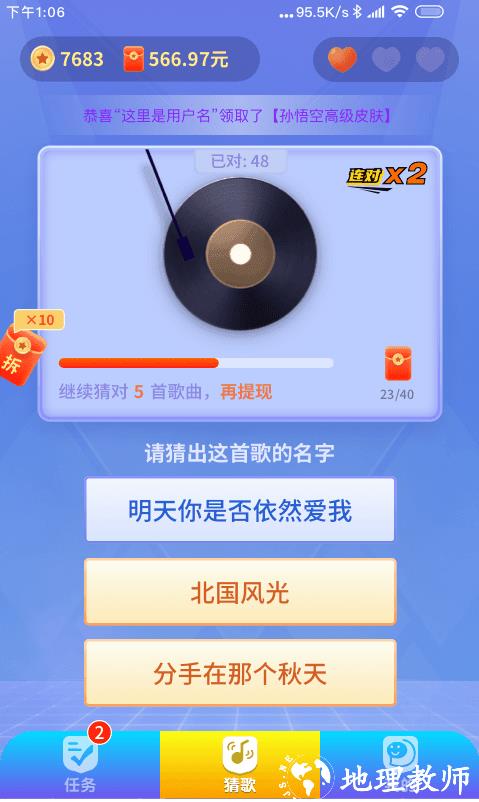1. 多样玩法:懒人猜歌提供了多种猜歌模式,包括闯关模式、竞技模式等,玩家可以根据自己的喜好选择不同的玩法,体验不同的挑战。