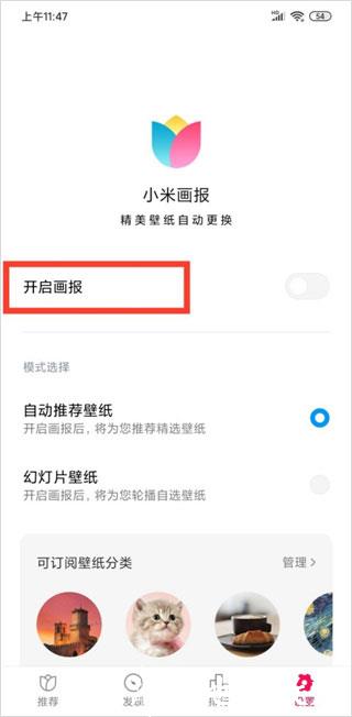 4、找到 “开启画报” 选项,点击其旁的 “开启键”,即可成功开启画报。
